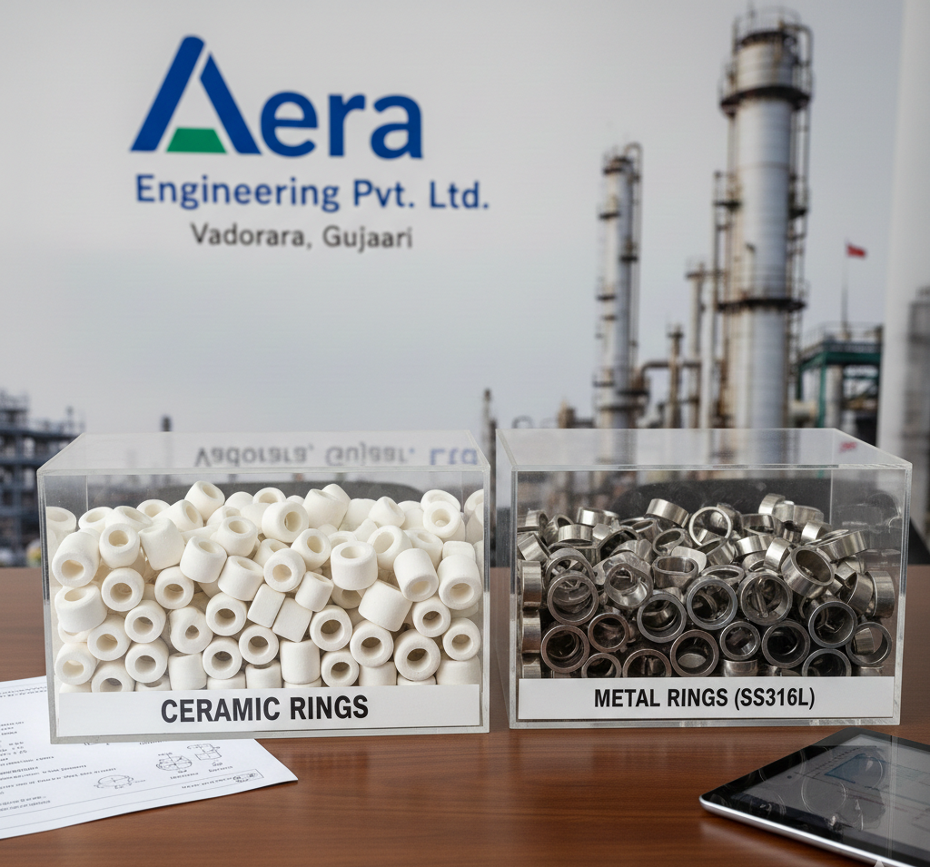 When designing a distillation or absorption tower, the choice of random packing material can be the difference between a high-efficiency plant and a maintenance nightmare. While the cylindrical shape of the Raschig ring is a century-old classic, the material—Ceramic vs. Metal—dictates how your system will handle heat, chemicals, and mechanical stress. At Aera Engineering Pvt Ltd, we provide both solutions to the industrial hub of Vadodara. Here is a technical breakdown to help you decide which material fits your chemical process. ________________________________________ Ceramic Raschig Rings: The Corrosion Specialists Ceramic rings are the traditional choice for environments where metals simply cannot survive. They are manufactured from high-quality alumina or porcelain, making them nearly inert. Best For: • Strong Acids & Alkalis: Ideally suited for sulfuric acid plants, hydrochloric acid scrubbers, and caustic systems. • Extreme Temperatures: Can withstand operating temperatures up to 1200°C, far exceeding the limits of most metals. • Contamination-Sensitive Processes: Being non-reactive, they won't leach metal ions into your product. The Trade-off: • Brittleness: Ceramic is prone to 'crushing' or breaking if the tower is packed too aggressively or undergoes extreme mechanical vibration. • Weight: They are significantly heavier than metal, which may require more robust internal support grids. Metal Raschig Rings: The High-Strength Workhorses Typically fabricated from Stainless Steel (304, 316L), Carbon Steel, or even Copper, metal rings are chosen for their structural integrity and superior flow dynamics. Best For: • High Mechanical Loads: In tall columns with massive packing heights, metal rings won't crush under their own weight. • Thermal Shock Resistance: Unlike ceramic, metal can handle rapid heating and cooling cycles without cracking. • Finer Wall Thickness: Metal rings have thinner walls than ceramic. This increases the void fraction (empty space), leading to a lower pressure drop and higher gas capacity. The Trade-off: • Corrosion Limits: Even SS316L has limits. In highly oxidizing or chloride-rich environments, metal will eventually pit or corrode. • Price Volatility: The cost of metal packing is tied directly to global steel and alloy market prices. Which Should You Choose? Choose Ceramic if your process involves aggressive inorganic acids (like H2SO4 or HCl) or operates at temperatures that would soften or melt stainless steel. It is the gold standard for acid-drying towers and chlor-alkali plants. Choose Metal if you need to maximize throughput (lower pressure drop) and your chemical environment is neutral or only mildly corrosive. It is the preferred choice for vacuum distillation and oil refining, where mechanical reliability is paramount. At Aera Engineering Pvt Ltd, we don't just sell packing; we help you engineer your process. Based in Vadodara, we understand the unique demands of Gujarat's chemical corridor. Would you like me to calculate the estimated pressure drop for a specific size of Ceramic vs. Metal rings for your tower?