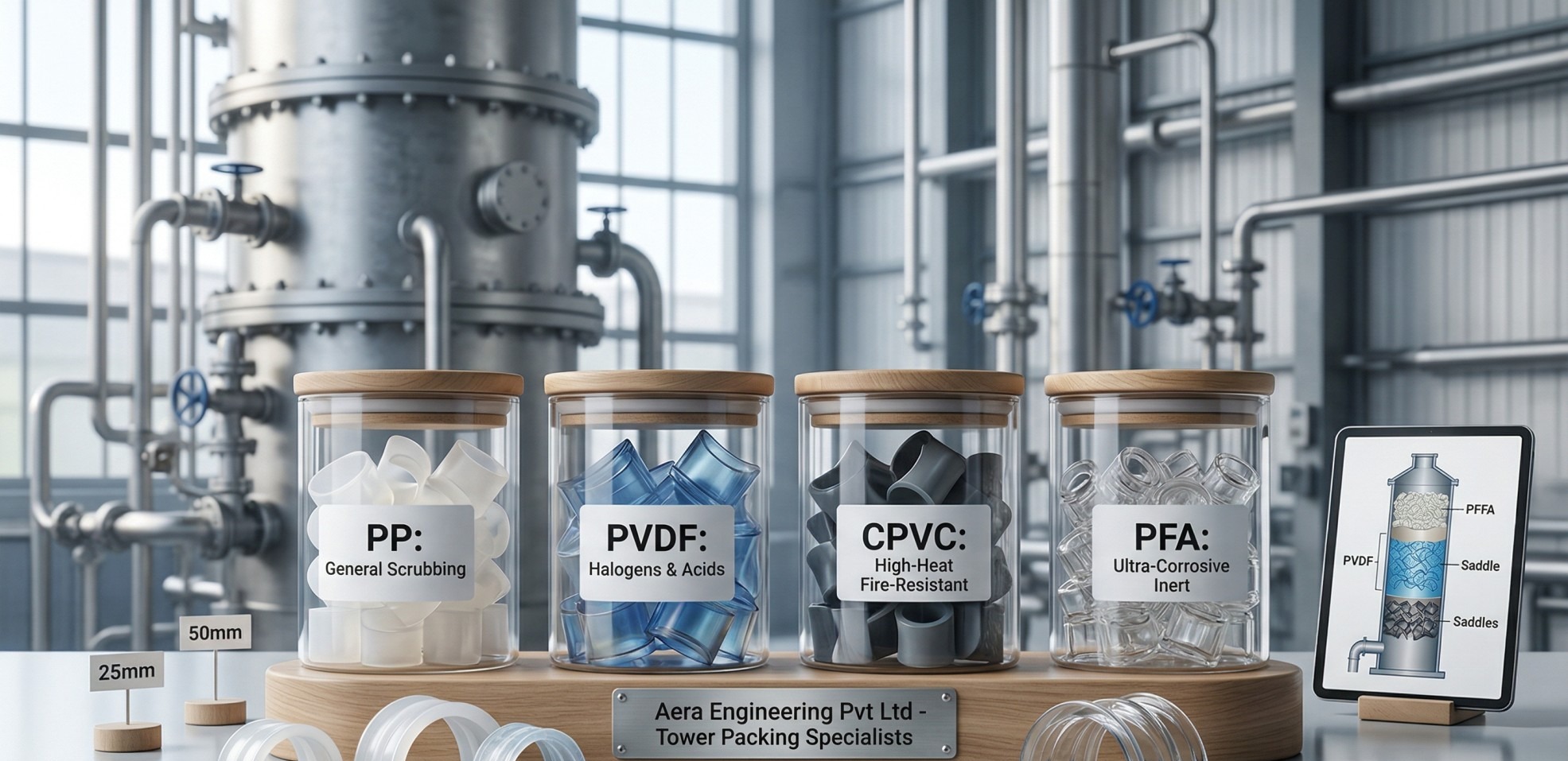 In the world of chemical processing and mass transfer, efficiency is everything. For companies like Aera Engineering Pvt Ltd, staying ahead of the curve means understanding the technical nuances of the equipment we manufacture. When designing a packed tower, one of the most critical decisions is selecting the right material grade for your Plastic Intalox Saddles. The 'best' plastic isn't the most expensive one—it’s the one that survives your tower's specific chemical and thermal environment. Why Material Grade Matters Plastic Intalox Saddles are designed with an aerodynamic, arched shape that maximizes surface area while minimizing pressure drop. However, the performance of that shape is only as good as the resin it’s molded from. Choosing the wrong grade can lead to: • Thermal Softening: The packing loses its shape and collapses. • Chemical Degradation: The plastic becomes brittle and 'dusts, ' clogging the bed. • Reduced Life Span: Frequent maintenance shutdowns that eat into your profits. Common Plastic Grades and Their Applications 1. Polypropylene (PP) – The Industry Workhorse • Characteristics: Lightweight, excellent chemical resistance, and the most cost-effective option. • Temperature Limit: Up to 90°C – 100°C. • Best For: Water treatment, cooling towers, and general acid/alkali scrubbing where temperatures are moderate. 2. Polyvinylidene Fluoride (PVDF) – The High-Performance Choice • Characteristics: Exceptional mechanical strength and superior resistance to halogens (Chlorine, Bromine) and strong acids. • Temperature Limit: Up to 150°C. • Best For: Chlor-alkali plants, bleach manufacturing, and high-temperature gas scrubbing. 3. Chlorinated Polyvinyl Chloride (CPVC) – For Mid-Range Heat • Characteristics: Better heat resistance than standard PVC and highly fire-resistant. • Temperature Limit: Up to 90°C – 95°C. • Best For: Chemical processing where PVC isn't enough, but the cost of PVDF isn't justified. 4. PFA / FEP / PTFE – The 'Inert' Specialists • Characteristics: These fluoropolymers are almost entirely chemically inert and can handle extreme heat. • Temperature Limit: Up to 200°C+. • Best For: Highly corrosive specialty chemicals, pharmaceutical distillation, and extreme solvent recovery. Conclusion: Partnering with Experts At Aera Engineering Pvt Ltd, located in the industrial heart of Vadodara, we specialize in manufacturing ISO 9001:2015 certified plastic saddles. Whether you need standard 25mm PP saddles for a cooling tower or custom PVDF packing for an aggressive chemical scrubber, our team ensures your tower internals are built to last. • Plastic Intalox Saddle manufacturer Vadodara • High-performance tower packing Gujarat • PP Intalox Saddle applications • PVDF Super Intalox Saddle supplier • Aera Engineering Pvt Ltd industrial packing Long-Tail Keywords: • Chemical resistance of PVDF vs PP saddles • Temperature limits for plastic tower packing • Mass transfer efficiency of plastic saddles • Corrosion resistant random packing for chemical towers • ISO 9001 certified tower packing manufacturers India