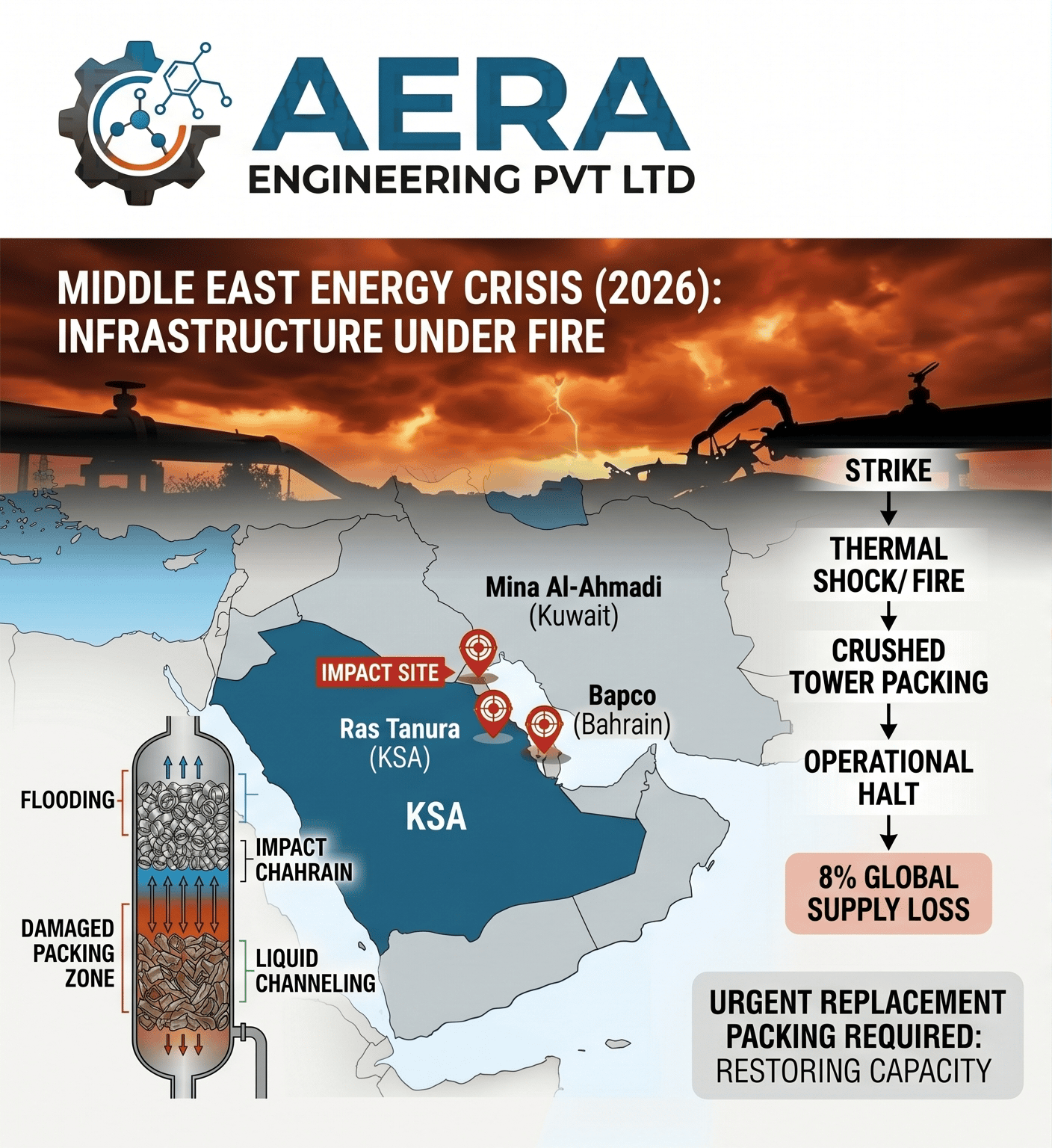In the complex landscape of 2026, the global energy sector is facing an unprecedented challenge. Conflict in the Middle East has moved beyond geopolitical tension into a direct 'economic war' on energy infrastructure. For refineries and petrochemical plants across the Gulf, the damage is no longer theoretical—it is physical, structural, and urgent. At Aera Engineering Pvt Ltd, we are seeing a critical spike in demand for tower internals—specifically random packing and support grids—as the region races to repair damaged distillation units and secure the global energy supply. The Current Crisis: Infrastructure Under Fire Recent reports from the first half of 2026 highlight a staggering reality: over 40 major energy assets across nine countries have been severely impacted by missile and drone strikes. Key refining hubs like Ras Tanura (Saudi Arabia), Mina Al-Ahmadi (Kuwait), and the Bapco Sitra Refinery (Bahrain) have faced operational halts due to direct hits on their distillation columns. When a missile or drone strike impacts a refinery, the damage to a distillation tower is twofold: Thermal Shock and Fire: High temperatures warp the precision-engineered internals, rendering the packing useless for mass transfer. Pressure Surges: Explosive forces can crush ceramic and thin-gauge metal packing into a solid mass, creating catastrophic blockages. Why Tower Internals are the 'Critical Path' to Recovery The International Energy Agency (IEA) has noted that global oil markets have lost approximately 8% of pre-crisis supply. Restoring this capacity isn't just about patching holes in a vessel; it’s about the rapid re-engineering of the tower's interior. 1. The Bottleneck of Damaged Packing Damaged packing leads to 'flooding' and 'liquid channeling, ' where the column fails to separate crude into usable fuels. Replacing these internals is the fastest way to get a refinery back to 'on-spec' production. 2. High-Efficiency Upgrades for Energy Security In a war-torn energy market, efficiency is a strategic asset. By replacing damaged 20th-century internals with modern, high-efficiency Aera P-Rings or Saddle Rings, refineries can actually increase their throughput beyond original design capacities, helping to offset the loss of other offline facilities. 3. Supply Chain Resilience With the Strait of Hormuz facing periodic closures, the logistical challenge of moving heavy equipment is immense. Aera Engineering, based in Vadodara, serves as a vital secondary supply hub. Our ability to manufacture and export precision Metal and Plastic Random Packing via alternate routes (like the Red Sea or Fujairah) is helping fill the gap left by primary OEMs currently facing 2-to-4-year production backlogs. Recovery by the Numbers Metric Impact of Current Conflict (2026) Infrastructure Damage Over $25 Billion in estimated repair costs. Supply Loss ~20 million barrels per day disrupted at Hormuz. Recovery Timeline 3 to 5 years for full restoration of major LNG/Refinery trains. Urgent Need Replacement internals for immediate distillation restarts. Aera Engineering: Your Partner in Resilience At Aera Engineering Pvt Ltd, we understand that every day a column sits idle is a day the global economy feels the pinch of $114/barrel oil. We are committed to supporting the Middle East's energy recovery with: Rapid Manufacturing: Prioritizing emergency orders for war-damaged refineries. Durable Materials: Supplying internals in SS316L, Monel, and Titanium to withstand the harsh, high-utilization environments of current operations. Engineering Support: Providing the technical data needed to swap failed trays for high-performance random packing to accelerate restart times. Turning Conflict into Capacity The road to energy stability in 2026 is paved with precision engineering. As the Middle East begins the long process of rebuilding, Aera Engineering is ready to supply the internals that keep the world's most vital industry moving. Contact Aera Engineering Pvt Ltd today to discuss fast-track procurement for international projects and refinery revamps. Source Context: Based on reported energy infrastructure status as of April 2026.